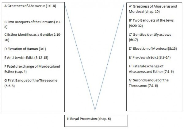 It is maintained that this book is historical. This book is many things and it would be a mistake to view it from just one angle. It is for example a tale of intrigue at court, a story of lethal danger to the Jews narrowly averted by heroic rescue. It is also a tale of the ascent of an orphan in exile to the rank of the most powerful woman, in the powerful empire. It is a story of how a humiliated and endangered minority, the Jews living in Diaspora after the Babylonian exile, came to be respected and feared by the Gentile majority and to see one of their own to be honoured with the position of the second most important person in the Empire. It is the comical story of a pompous fool who does himself in, and the chilling tale of the narrow escape from death of a despised and vulnerable minority. One way to view the structure of the narrative is in terms of ten banquets, that is, five sets of two. The following diagram demonstrates a pattern of symmetry to the book, with chapter 6 being the pivot chapter where the exchange of status between Haman and Mordecai happens.